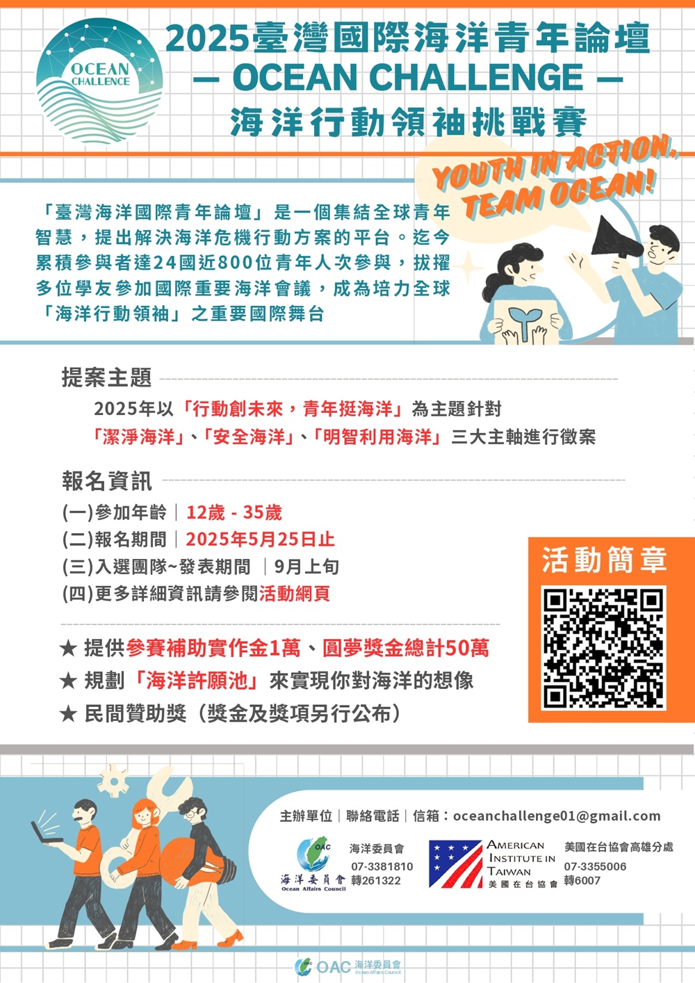 全球青年看過來!2025臺灣海洋國際青年論壇正式啟動,邀請12至35歲的青年提出創新提案,共同解決海洋面臨的危機,守護地球的藍色未來。本論壇由海洋委員會與美國在臺協會高雄分處(AIT/K)共同主辦,提供豐厚獎勵與國際曝光機會,讓青年的行動為世界帶來改變。