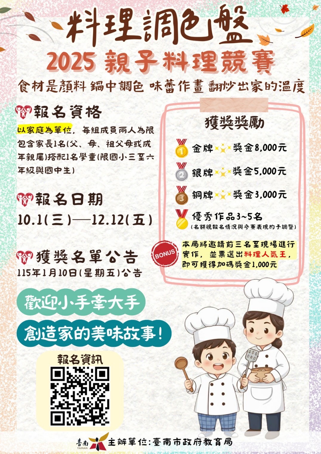 看見孩子天馬行空的創意!臺南市教育局舉辦2025學校午餐「料理調色盤」親子料理競賽溫馨登場,邀請具有料理魂的國小三至六年級及國中學生揪家長一起來挑戰,用食材作畫、用味蕾說故事,共同創造獨一無二的親子回憶。報名日期自10月1日起至12月12日止,歡迎手刀報名,不僅有豐富獎金,獲獎隊伍更將受邀於現場展現廚藝實力!