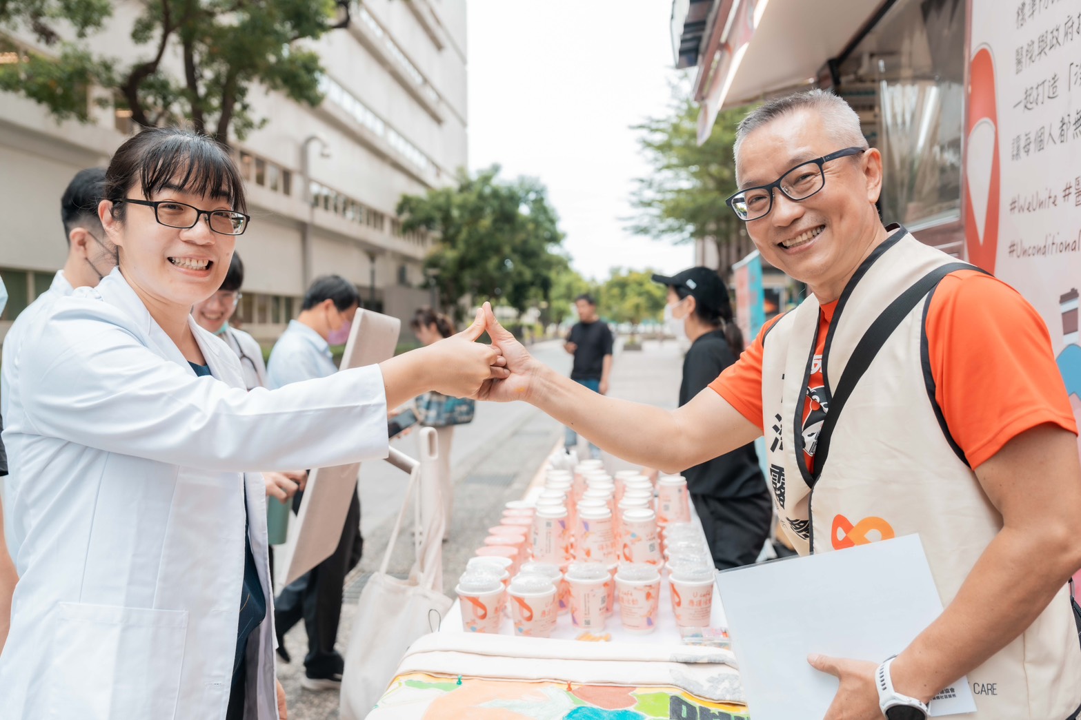 高雄長庚紀念醫院長期關注感染者醫療照護與心理需求,今年響應以「在U世代·We Unite」為主題的U Café應援活動,透過現場提供免費咖啡、互動藝術創作與知識宣導等方式,不僅感謝辛勞的醫護同仁,更藉此翻轉社會對愛滋的刻板印象。活動中設有「愛的打勾勾」帆布畫創作區,邀請醫護人員參與繪畫,象徵醫病攜手共築友善醫療的承諾。