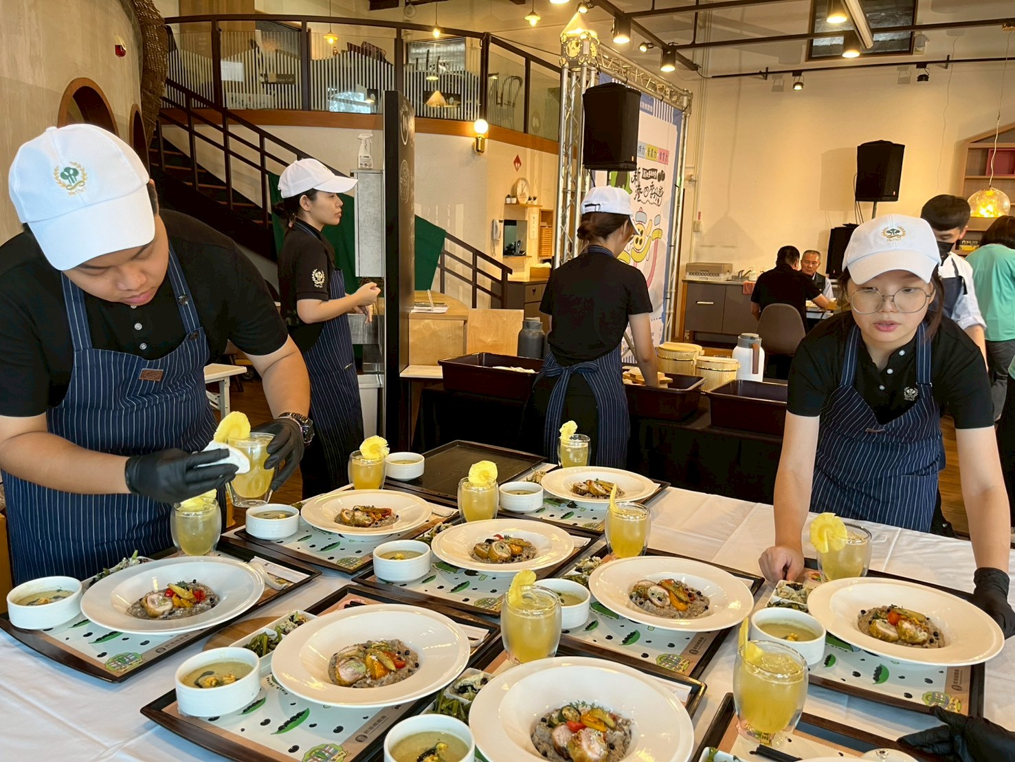 此次套餐的主食更精心融入新港四大作物特色,包括活力燉雞輕食盤佐玉米佛卡夏則以玉米主題呈現溫暖家常風貌,搭配嫩煮雞肉與香氣麵包,展現新港春收的豐;鳳梨黑豆穀物炒飯佐青醬台灣鯛魚排,以鳳梨炒飯的酸甜為基底,結合在地黑豆與鮮嫩台灣鯛,搭配空心菜青醬,營造酸甜、鹹香與綠意清香的平衡味覺;義式松露黑豆燉飯佐空心菜慕斯雞肉捲,融合義大利經典燉飯工藝,以馥郁的黑松露與營養黑豆提升奢華風味層次,再以新港在地空心菜製成的青醬慕斯包裹雞肉捲,呈現清新與醇厚並存的風味體驗盛。除了主食料理,本次研發也加入四大作物之豆花、豆腐等現場 DIY 體驗,讓參與者透過視、聽、嗅、味、觸、心與群體共享七種感官,親手感受豆漿凝固、風味轉化與作物生命力,使餐桌成為理解農村文化的感官入口。