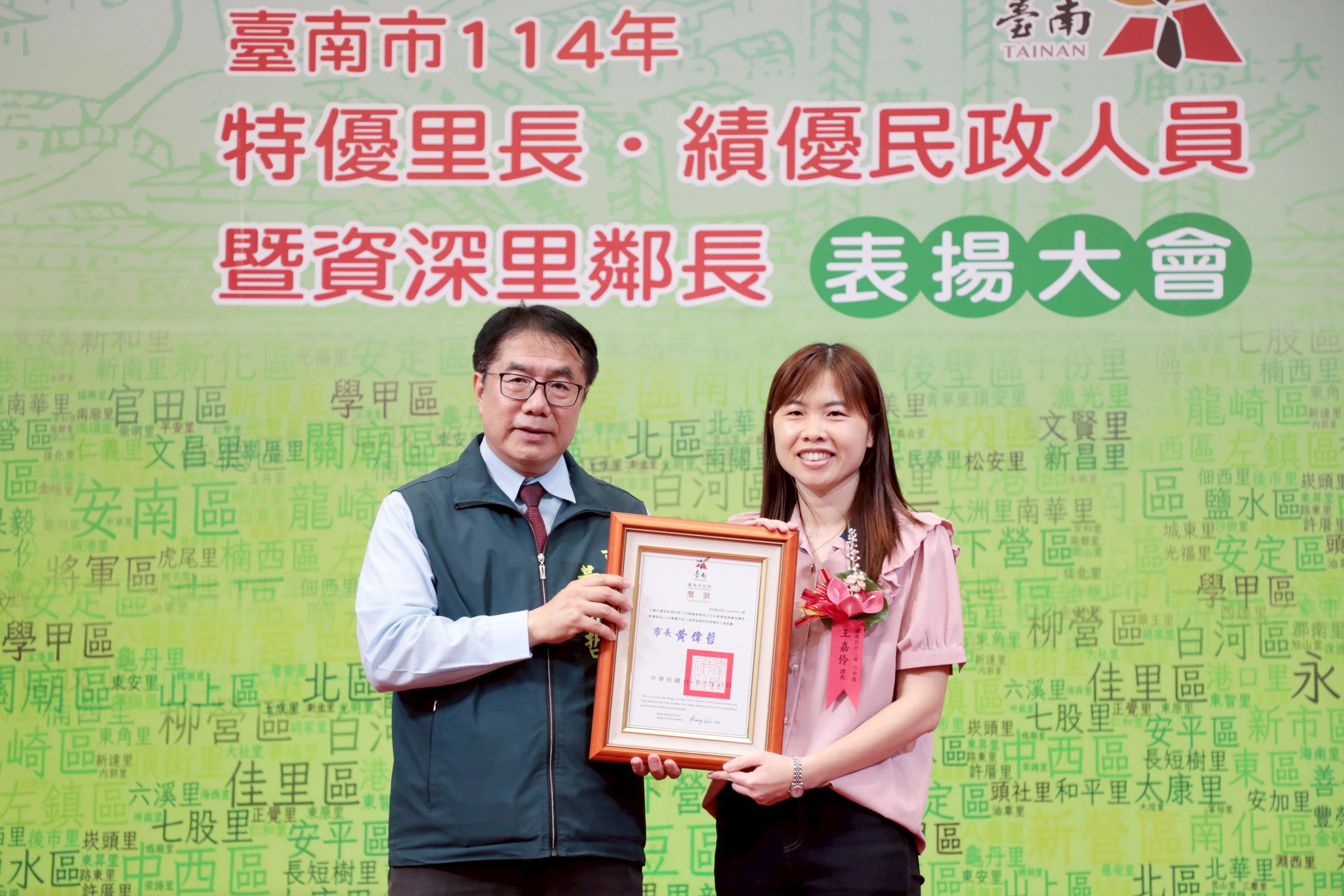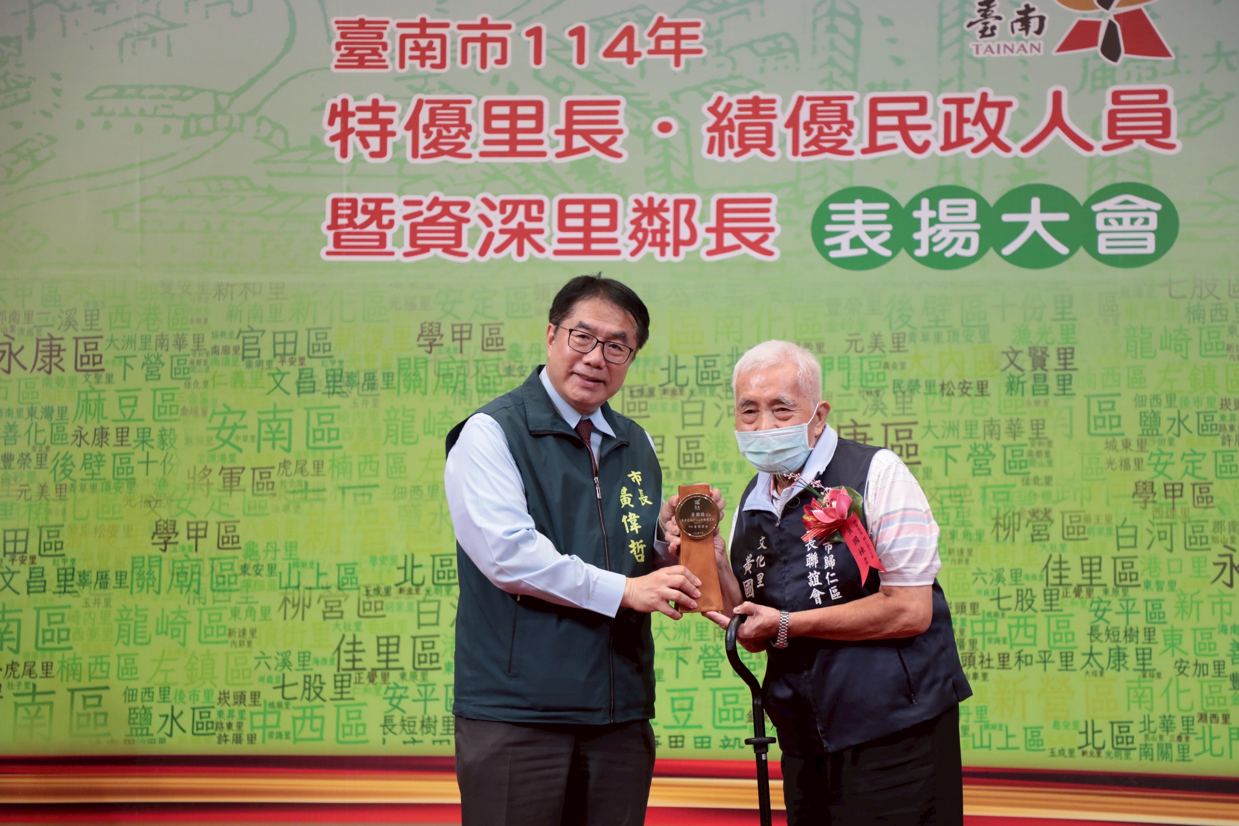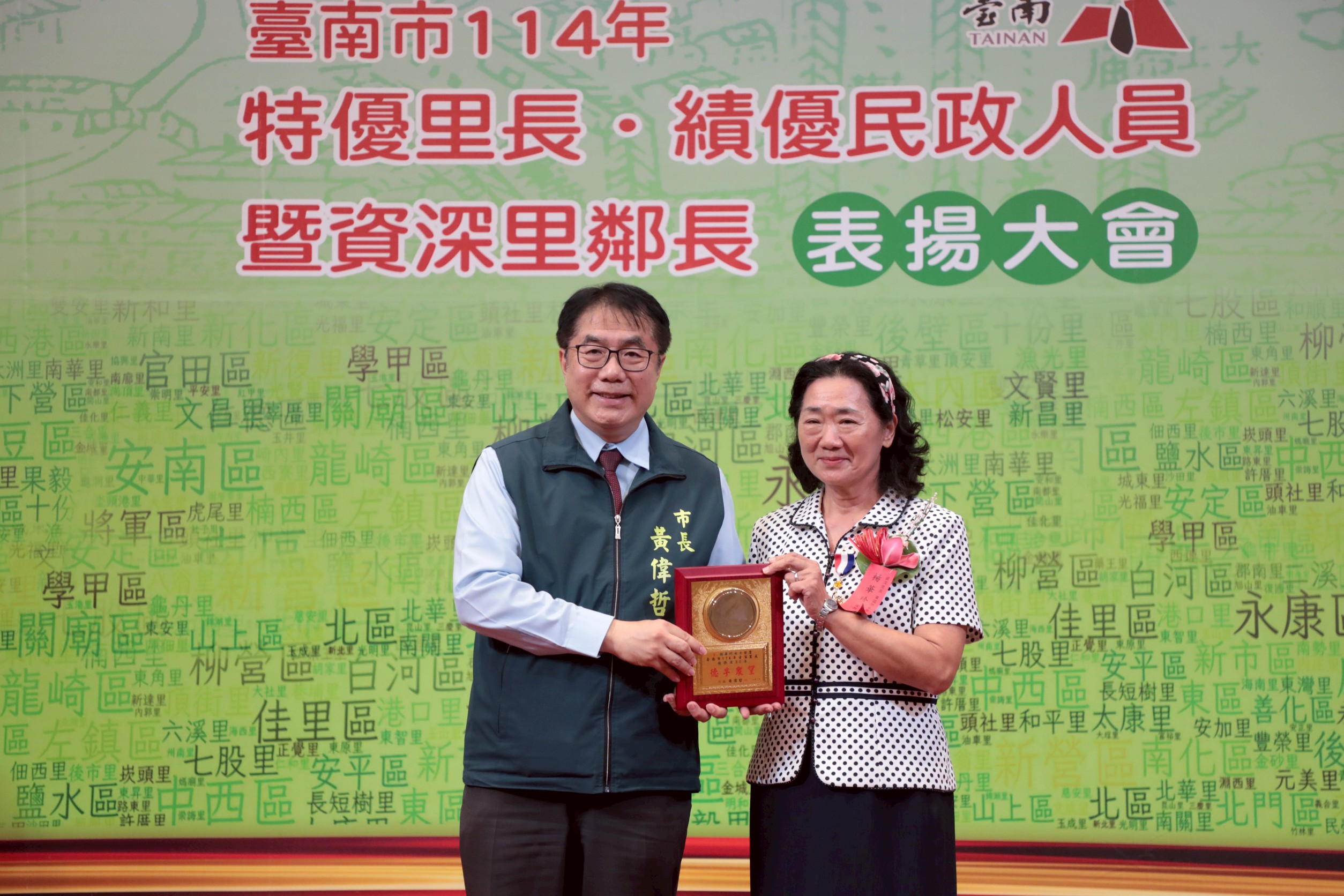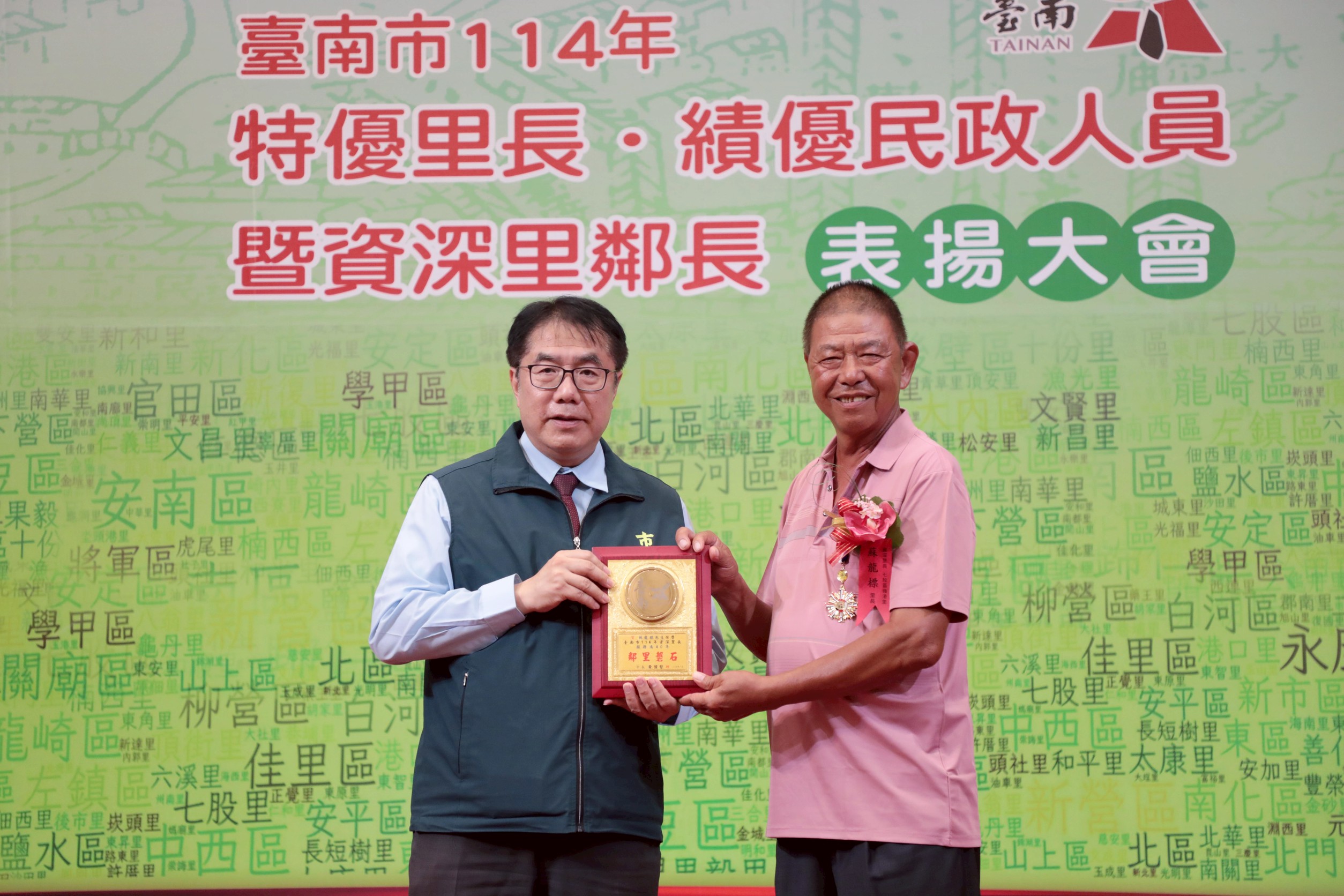 台南市政府今(28)日上午於安平區福爾摩沙遊艇酒店舉辦「114年特優里長、績優民政人員暨資深里鄰長表揚大會」,由市長黃偉哲親自頒獎予148名獲獎里鄰長,肯定他們長期投入基層服務、守護市民的無私奉獻。