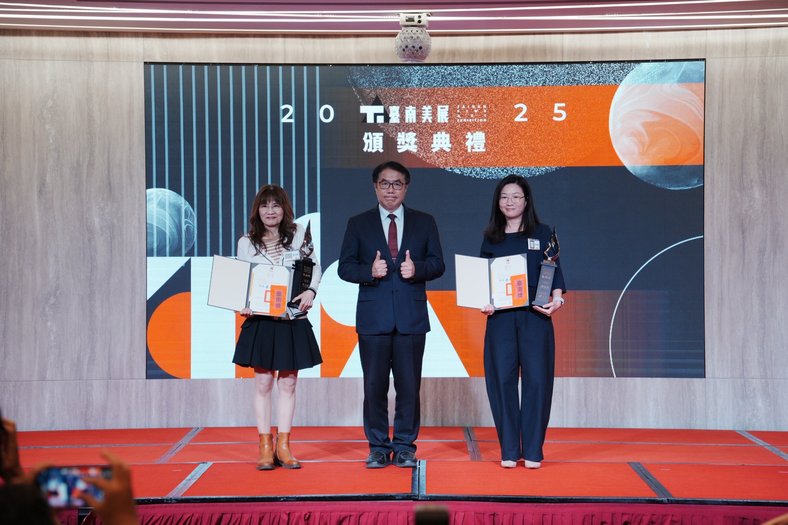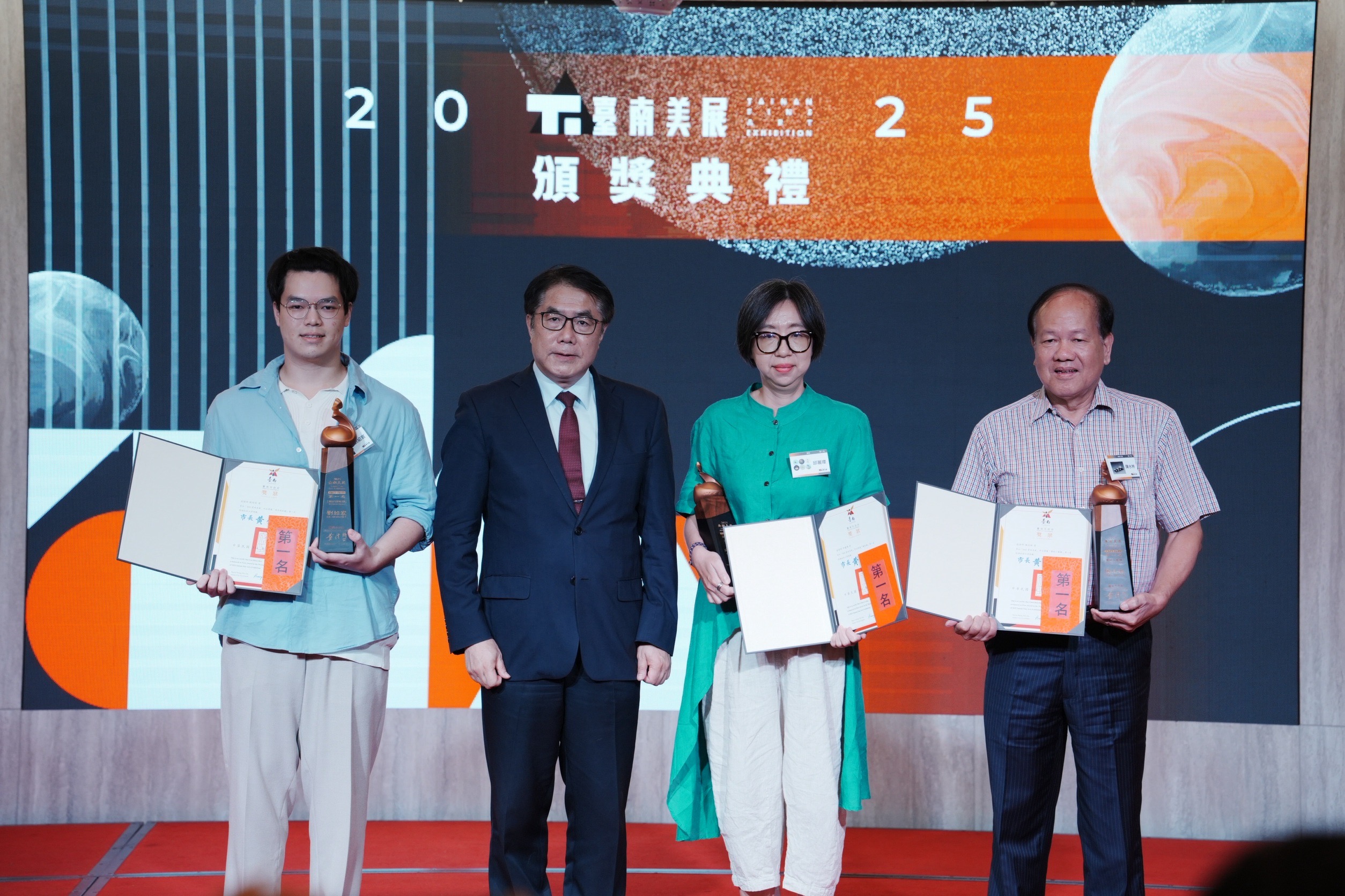 臺南市政府今(20)日下午於台糖長榮酒店三樓嘉賓廳,隆重舉行「2025臺南美展」頒獎典禮。臺南市長黃偉哲、文化局長黃雅玲、甘樂阿舍美術館館長曾若璇親臨現場,頒發獎座予所有得獎者,並與藝文界前輩、藝術家們齊聚一堂,共同見證這場藝術盛會。