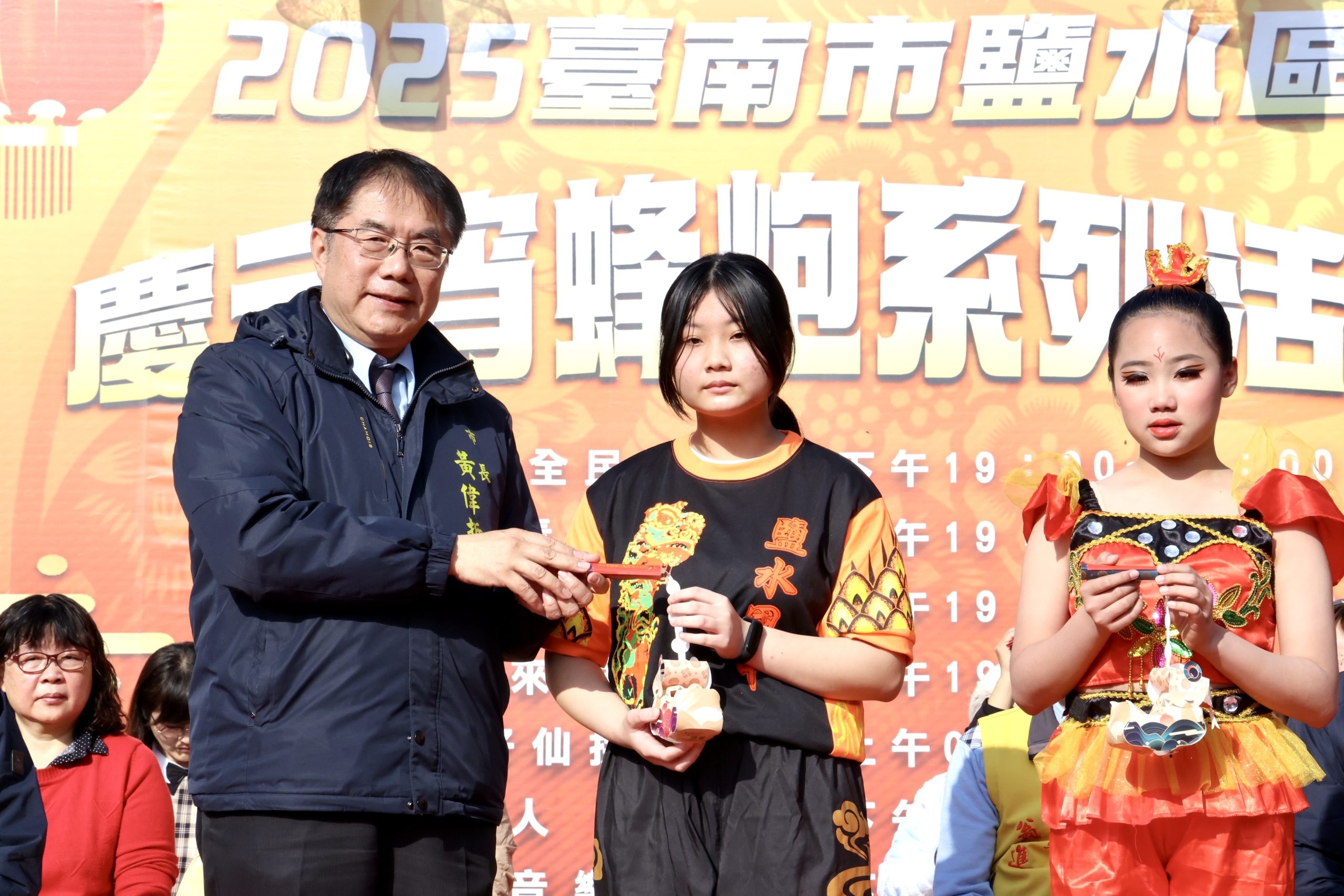 市長黃偉哲表示,鹽水蜂炮享譽國際,擁有「全球十大最佳慶典」美譽,也是臺南市的重要歷史民俗活動,而鹽水蜂炮所保存的文化軌跡與宗教用意,不僅延續過年歡樂的氣氛,更是希望為地方祈福,他也誠摯邀請大家一起來鹽水體驗,感受蜂炮所帶來的魅力與震撼,並提醒在蜂炮活動進行時,首要注重自身安全,相關防護裝備一定要做足做好,他也特別感謝參與表演學校辛勞的付出,以及鹽水武廟的支持延續,讓活動內容一年比一年精采可期。