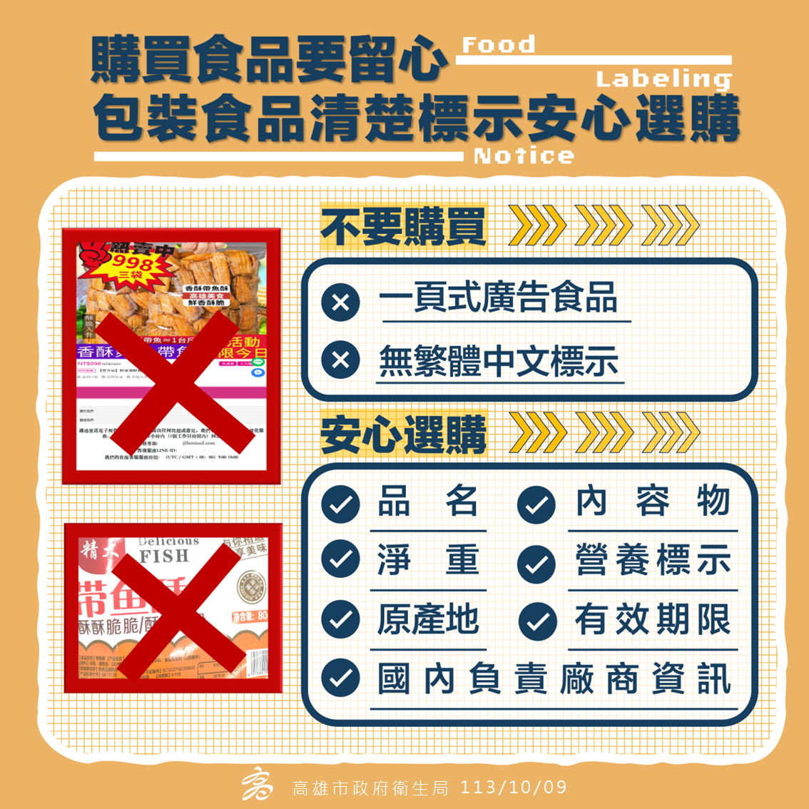衛生局提醒消費者「一頁式廣告」,實在虛實難辨,最好的方式就是認明品牌,對問題食品網站勿網購,提醒採購網路食品應認清完整包裝標示之下列事項,以確保食的安全:1.繁體中文標示。2.品名。3.內容物名稱。4.淨重、容量或數量。 5.製造廠商或國內負責廠商名稱、電話號碼及地址。6.有效日期。7.原產地(國)。8.營養標示。9.食品添加物名稱。10.含基因改造食品原料。11.其他經中央主管機關公告之事項。若買到問題產品應立即向各地方衛生局檢舉。倘有消費或爭議問題,撥打消費者專線1950,市府消保官可協助洽業者進行協調。