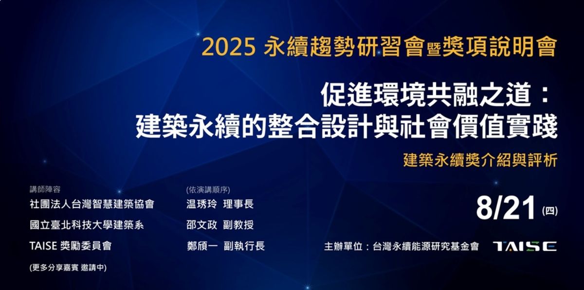 台灣永續能源研究基金會(TAISE)長期致力發展 ESG、氣候變遷與聯合國永續發展目標(SDGs)推動,並且透過政策倡議、教育推廣、國際交流與獎項設置等方式,來讓永續思潮實質落地 。其中,TAISE 的「建築永續獎」正是鼓勵官、產、學界於建築規劃、設計、施工與營運中納入永續理念的鼓勵措施,這已超越獎項本身設立,更彰顯了 TAISE 作為建築永續轉型推手的關鍵角色。